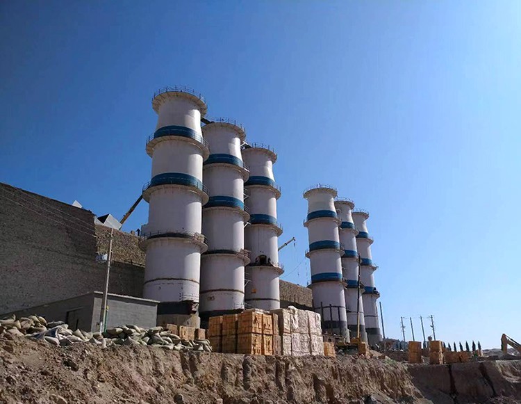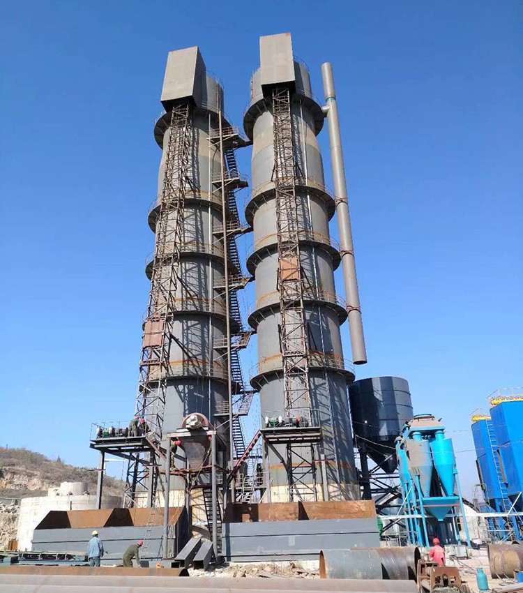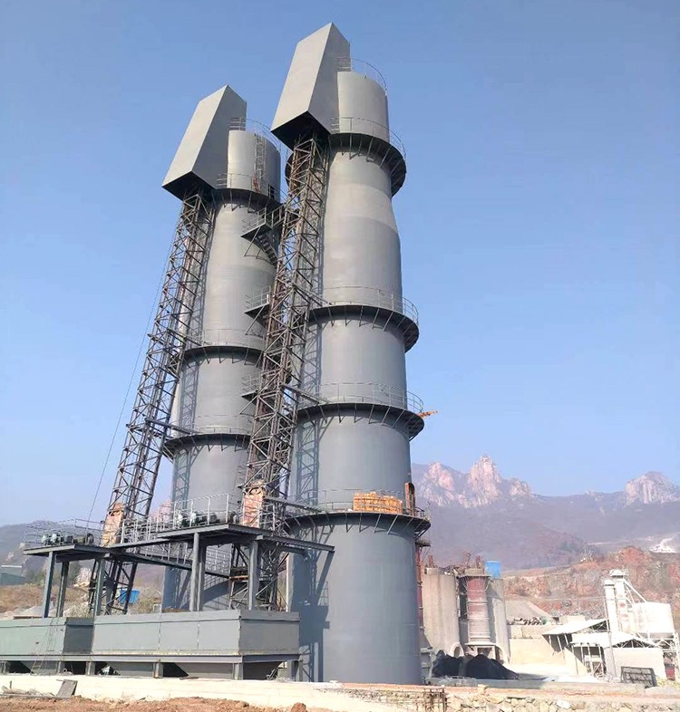 1、石灰立窑,包括外壁,内衬,窑体内承重底板,环形操作间兼进风通道,窑下内支撑壁钢筋混凝土主立柱和基础结构。